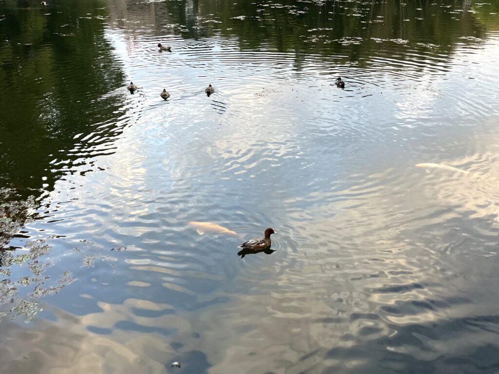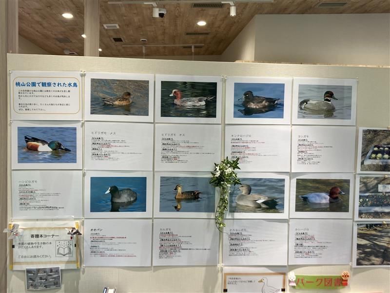 本日は雲の多い晴れた1日となりました。現在、春日大池には飛来してきた水鳥たちが水面を泳いでいます。桃山公園パークセンターでは、池にいる水鳥たちについて写真とともに紹介しているコーナーを設置しいます。池で観察した後、パークセンターで水鳥の紹介を見てみてはいかがですか。