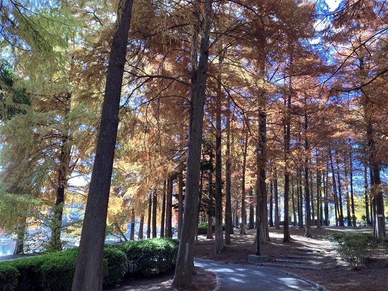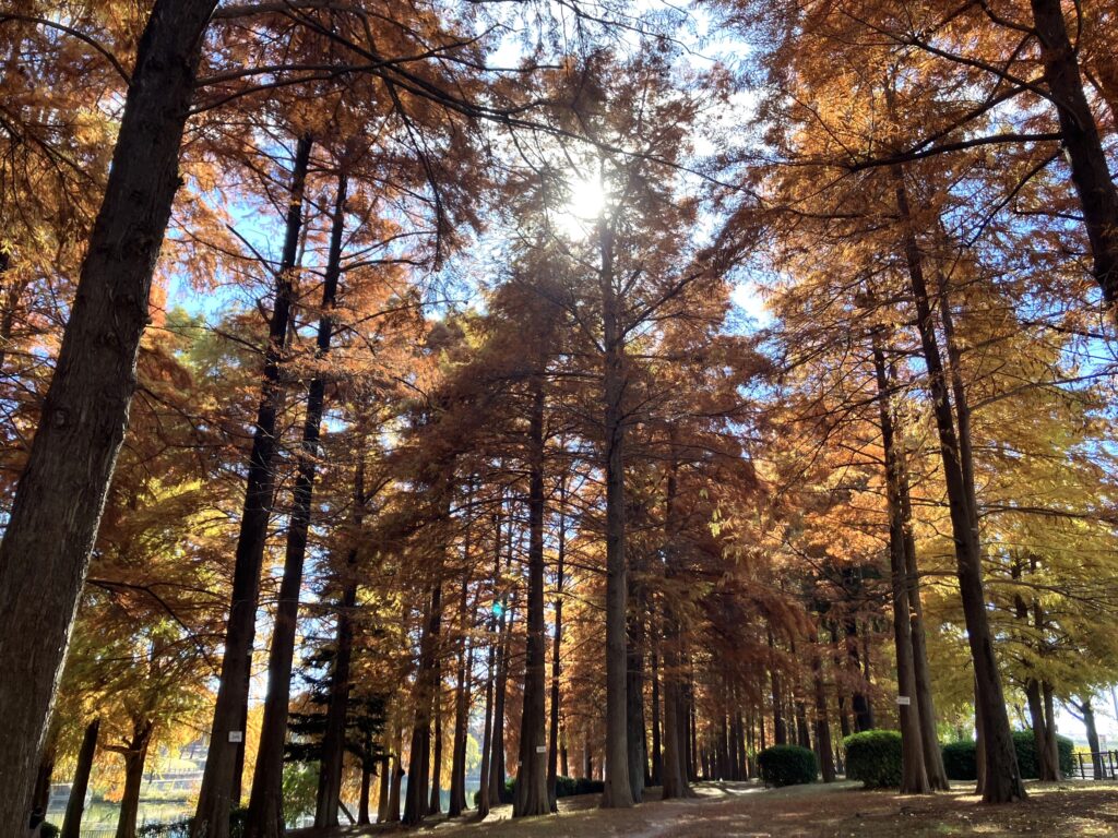 3連休2日目勤労感謝の日の本日は青空が広がる秋晴れな一日となりました。公園内では葉が赤く色づいているラクウショウの木々を写真に撮っていたり、シートを敷いてゆっくりされていたり、運動や散歩と利用者の方々が様々な方法で公園を楽しんでおられました。また、パークセンターにも多くの方が来られ、イートインスペースをご利用されていました。公園へお越しの際は、景色を見ながらゆっくりしたり、散策するなど秋の桃山公園をお楽しみください。