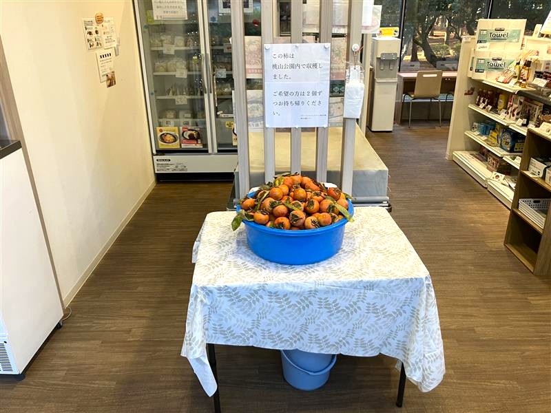 12月がスタートしました。昨日、桃山公園ボランティア団体の桃山公園クラブ様と一緒に収穫した柿を本日のパークセンター開館時より、入ってすぐの場所に柿の特設コーナーを設けました。お一人様2つずつご自由にお持ち帰りください。