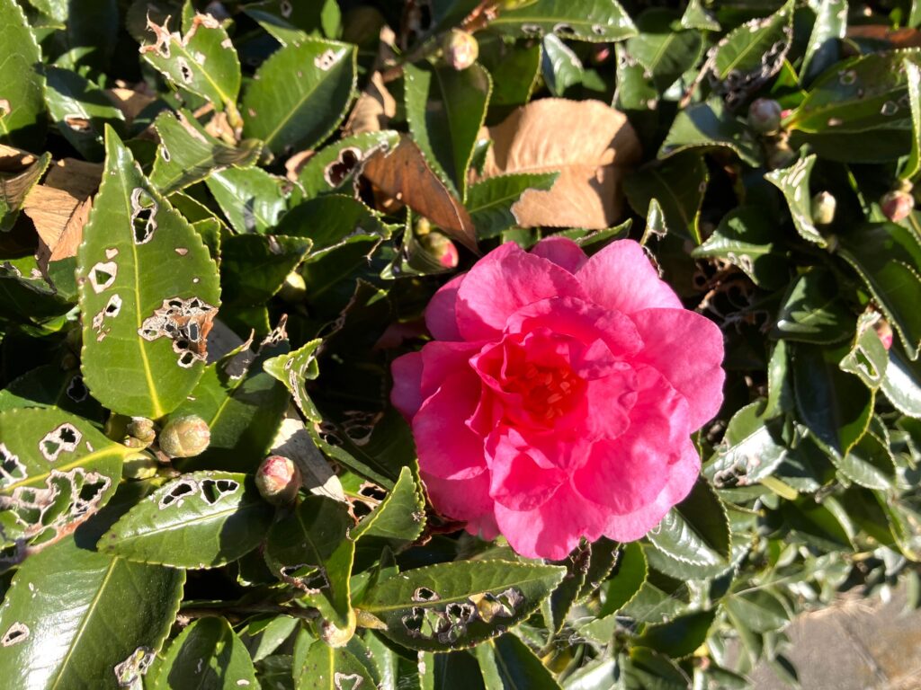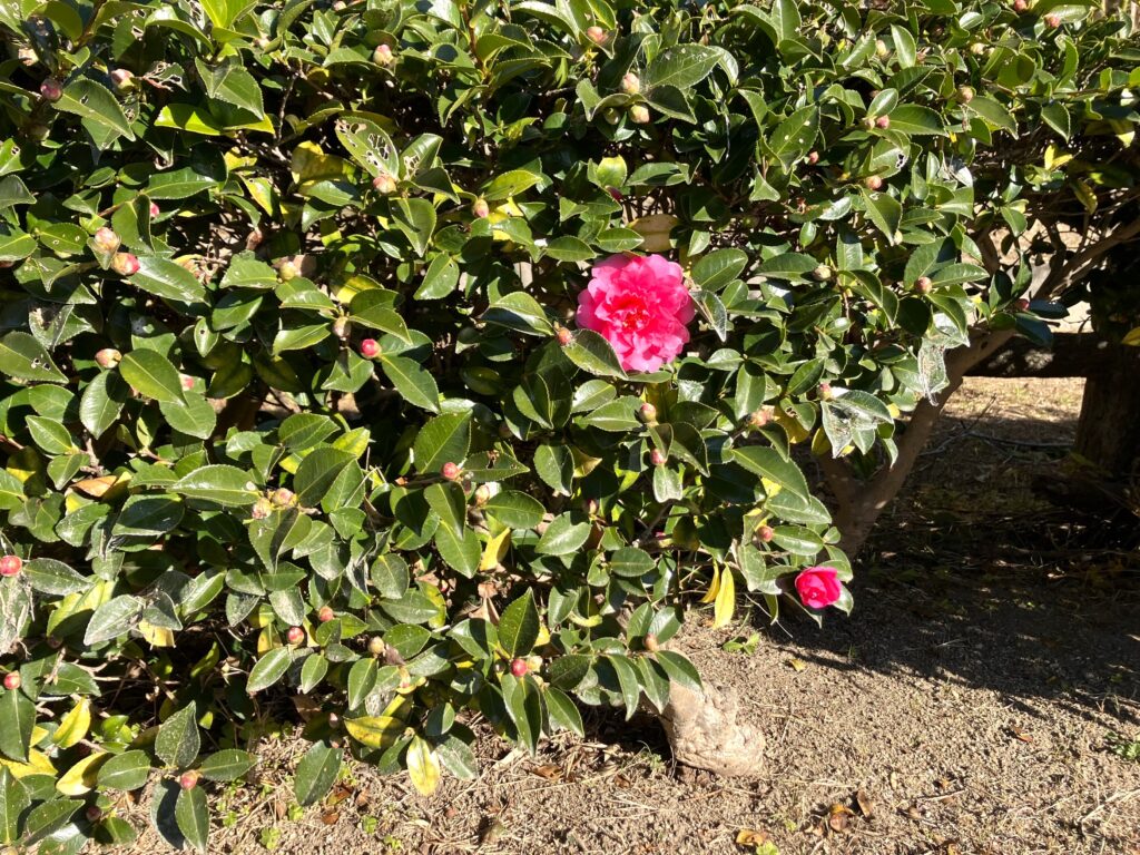 本日は晴れていましたが、寒い風の吹く一日となりました。桃山公園の南東側の遊歩道を歩いてみると、まだ蕾が多くありますが、サザンカが鮮やかなピンク色の花を咲かせ始めていました。公園にお越しの際は、花を見ながら散策してみてはいかがですか。