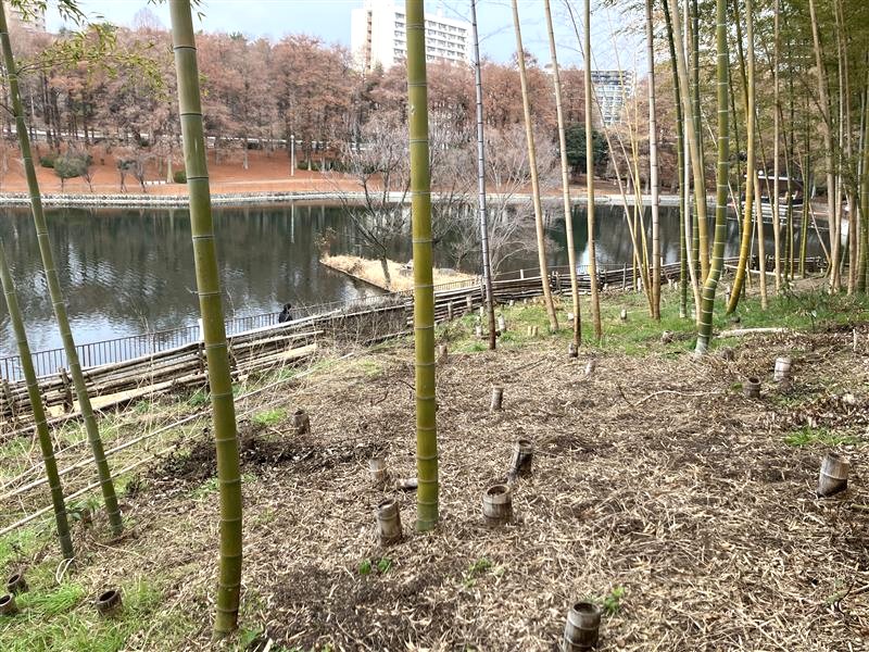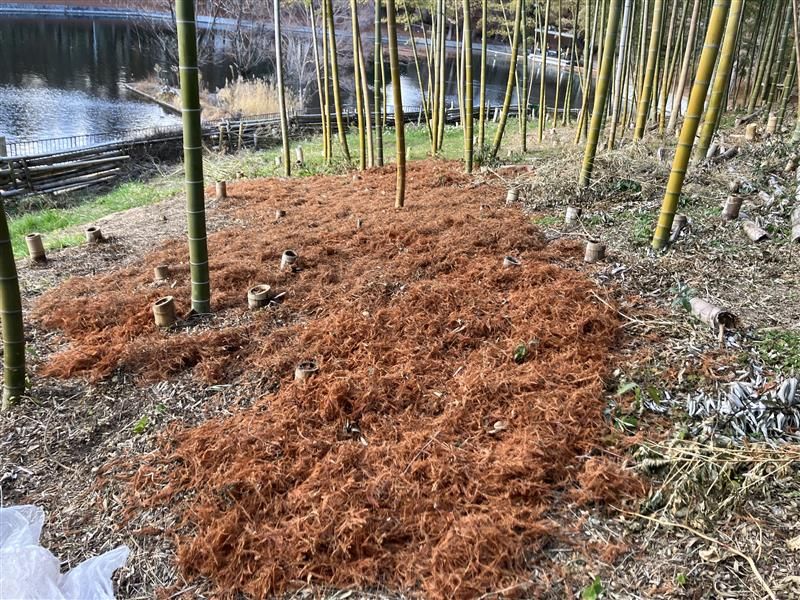 アドバイスをいただき、令和6年12月26日に竹林の西側に範囲を決め、生育を促すための肥料を撒き、その上から、土壌の水分量を保たせ、乾燥を防ぎ、保温効果のあるマルチングを公園のラクウショウの葉を使用し実施致しました。