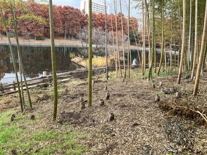 実施結果として、令和6年12月に実施し、現在に至るまでの結果としては付近に新竹が生えているのを確認したため、一定の効果はあったのではないかと考える。(下の写真左は令和7年1月5日、真ん中は令和7年12月8日、右は令和8年1月5日に撮ったもの)