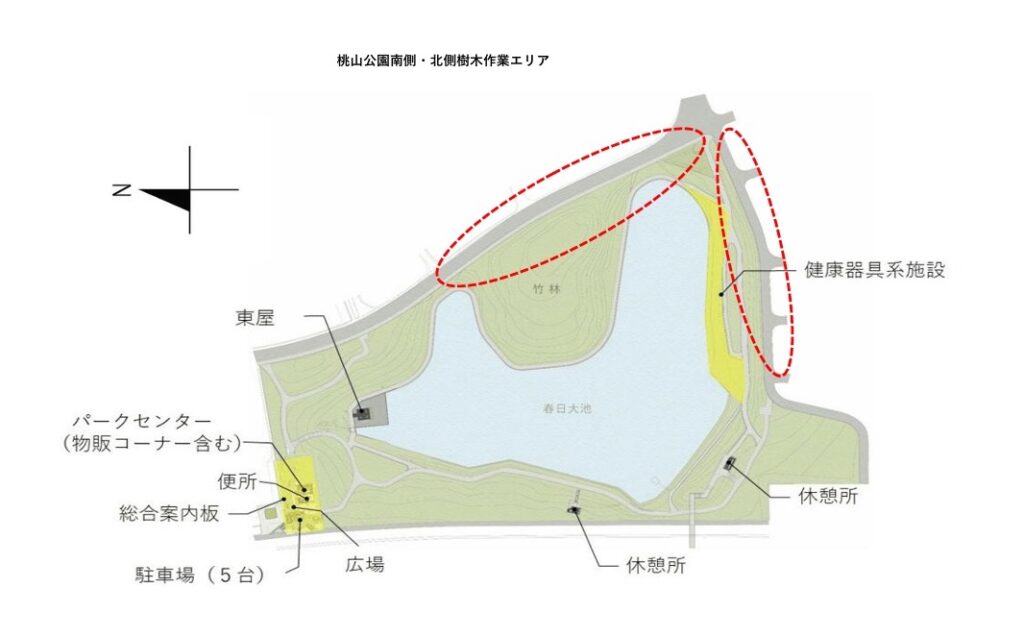 このたび、桃山公園内南側電線に接触している樹木及び北側の越境枝剪定及び枯木等の伐採作業を実施することとなりましたので以下の通りご案内いたします。作業中は、ご不便をおかけしますが、万全を期して作業しますので、ご理解とご協力の程宜しくお願い致します。