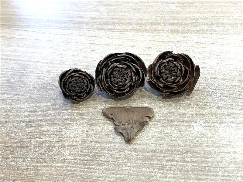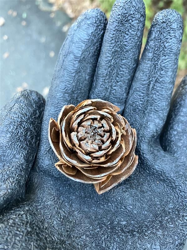 桃山公園の園路上を掃除していると、花のような形をした木の実が多く落ちています。写真の実を調べてみるとヒマラヤスギの実で、自然に落ちる際に周りがボロボロと落ちる中、中心部だけ残った状態で、バラのように見えることから『シダローズ』と言われています。公園にお越しの際は、散策しながら木の実を探してみてはいかがですか。
