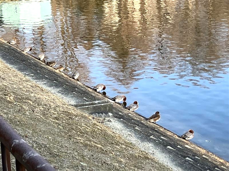 本日は天候は晴れ、外は肌寒い一日となりました。公園を周っていると、ヒドリガモが春日大池から陸地に上がり、横一列で休んでいました。公園へお越しの際は、野鳥観察しながら桃山公園をお楽しみください。