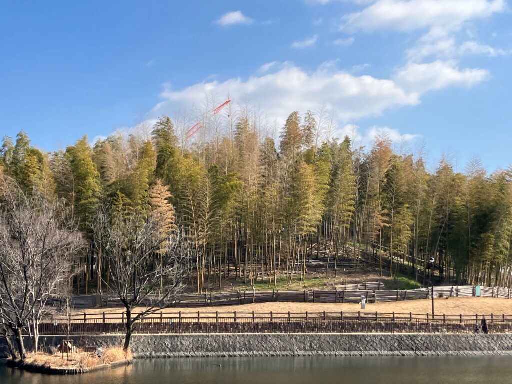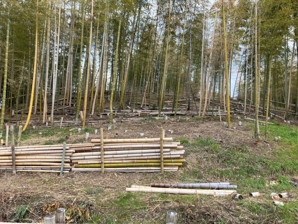 本日は竹林を対岸西側(中央)より竹林を確認しました。前回確認した時と同じで枯竹が多い印象です。また、マルチング箇所(西側)近くを見てみると少しずつ変色している竹等もありました。伐採後の竹もあり、今後その処理も行いつつマルチングの日程確定次第作業していきます。