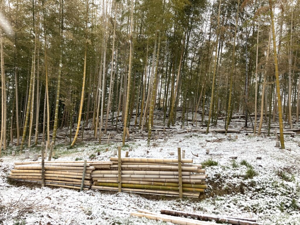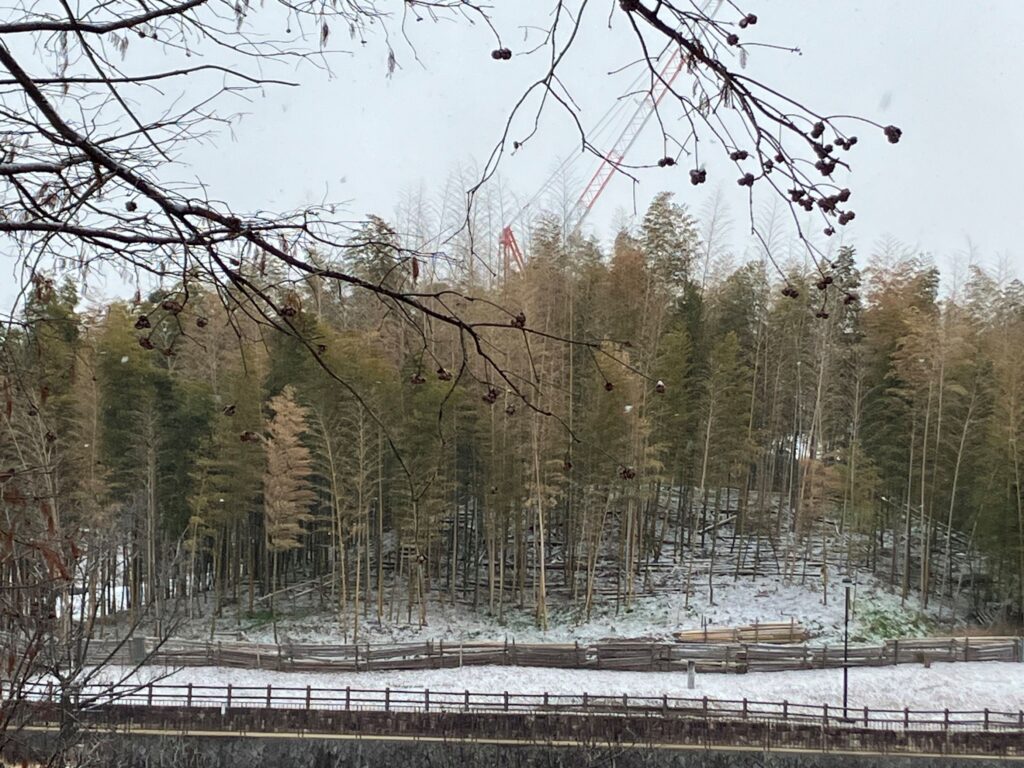 本日は竹林を対岸西側より竹林を確認しました。今日は朝から雪が降り、竹林内にも薄っすらと雪が積もっていました。また、西側のマルチング再実施予定箇所も雪が薄っすら積もっていましたが、以前より少し草が伸びてきているように感じました。今後も確認を継続していきます。