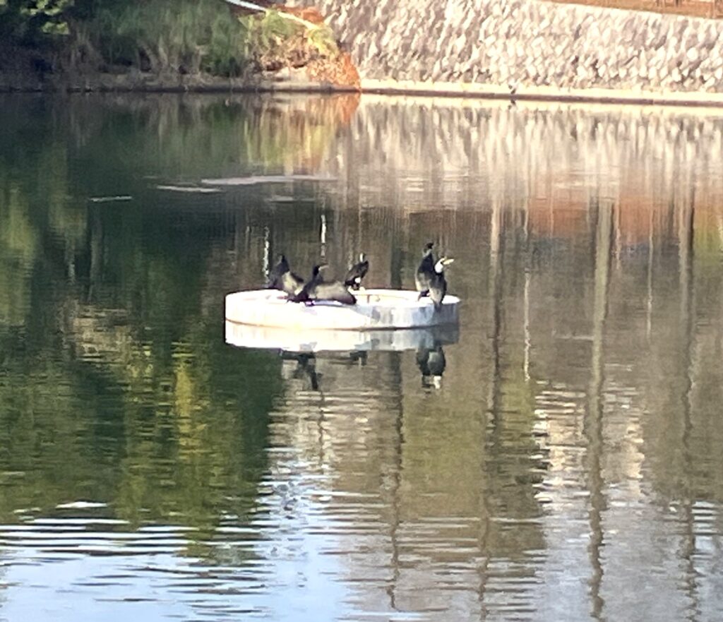 本日、晴れた一日となりました。公園を周っていると、現在は動いていない春日大池の噴水の上でカワウが休息をとっており、1羽のカワウは翼を大きく広げていました。(潜水し濡れた翼を乾かしていると思われる)桃山公園には様々な野鳥が飛来していますので、公園へお越しの際は、観察してみてはいかがですか。