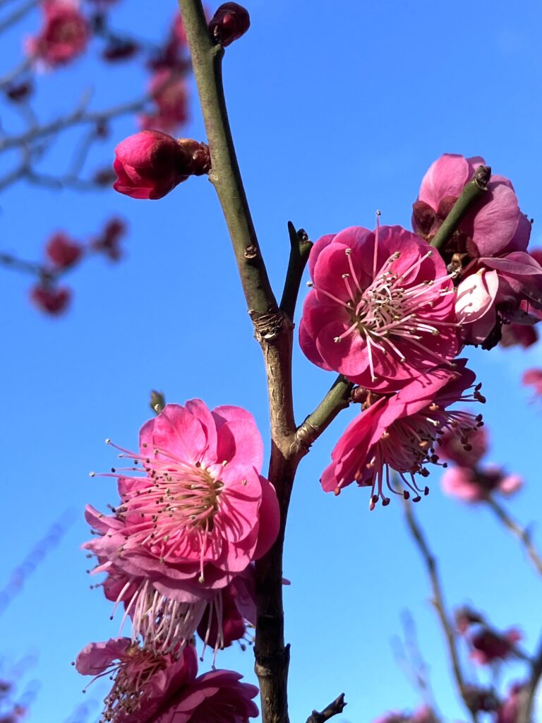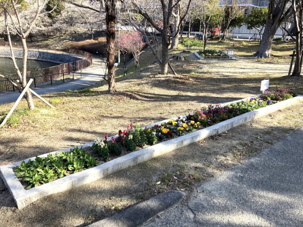 以前南東側の白梅を紹介しましたが、他にも紅梅(一部蕾もありますが)や水仙が綺麗な花弁を咲かせています。また、南出入口の付近には公園ボランティアの方に植えていただいた花が綺麗に咲いています。桃山公園へお越しの際は、散策しながら綺麗に咲いている花々を鑑賞してみてはいかがですか。
