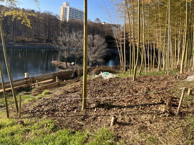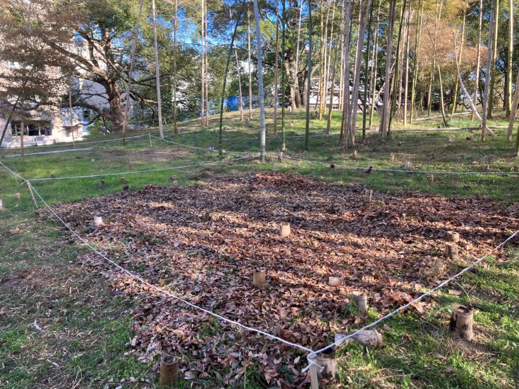 本日、竹林内3箇所にて、新竹の生育を促すために肥料を撒き、その上から、土壌の水分量を保たせ、乾燥を防ぎ、保温効果のあるマルチングを桃山公園と中の島公園で回収したケヤキの落葉を使用し実施致しました。