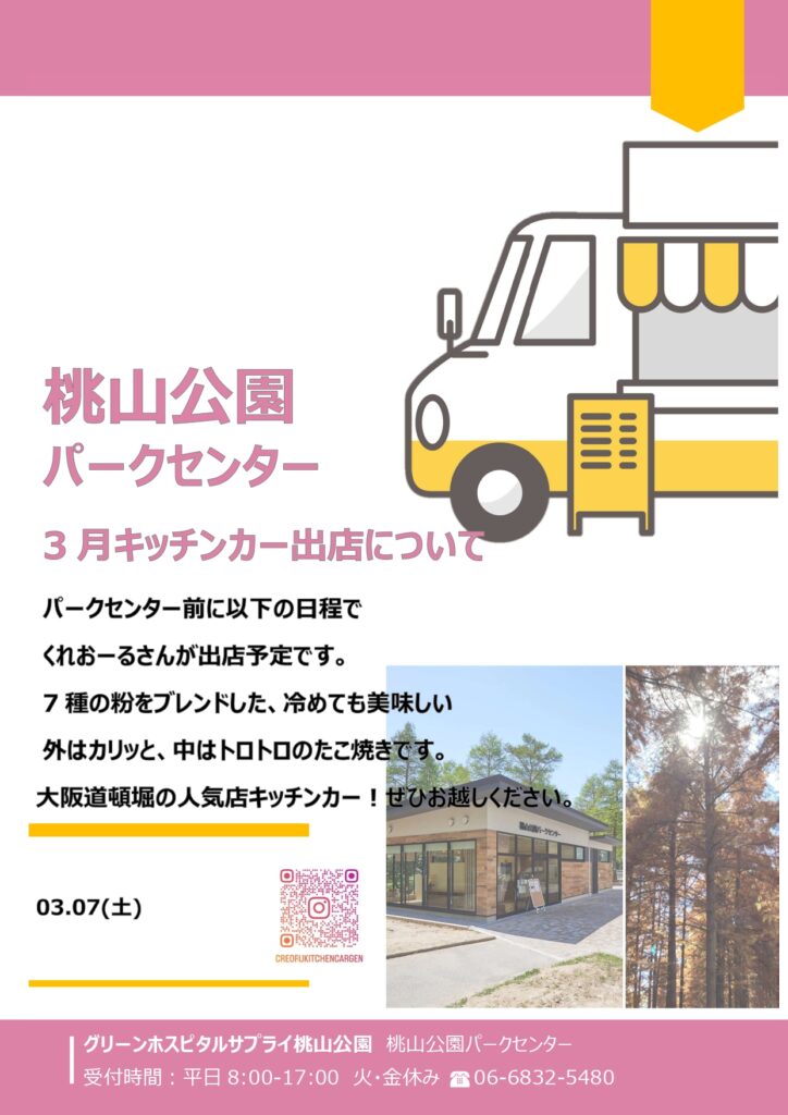 お知らせ 3月キッチンカー出店のお知らせ 2026-02-24 桃山公園 3月は2台のキッチンカーがパークセンター前に出店予定です。来園される際はぜひお立ち寄りください!※悪天候等により営業時間及び出店スケジュールは予告なく変更する可能性がございます。 たこ焼きカーMAIDO くれおーる
