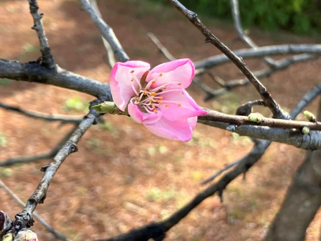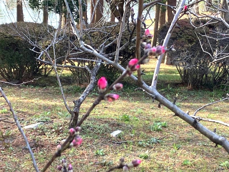 パークセンター横にあるアーモンドの木を確認してみるとピンク色の花ビラを開かせ始めている蕾が一輪ありました。まだまだ蕾が多いですが、昨年同様、今年も桃色の綺麗な花を咲かせるのが楽しみです。