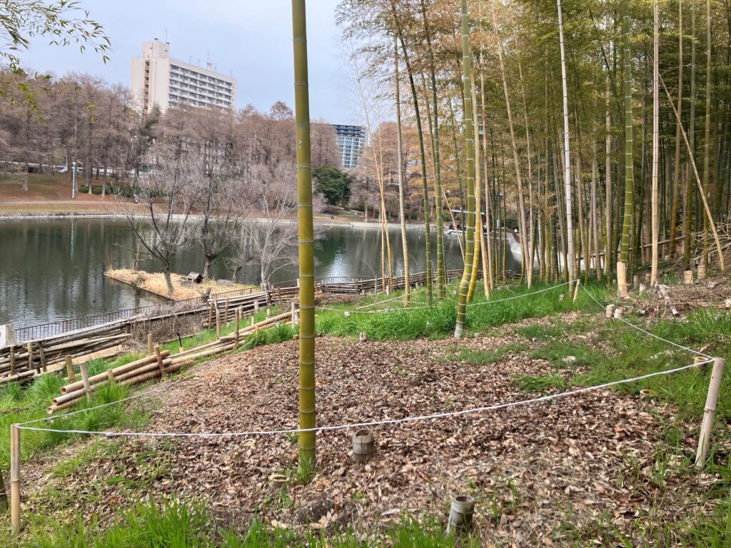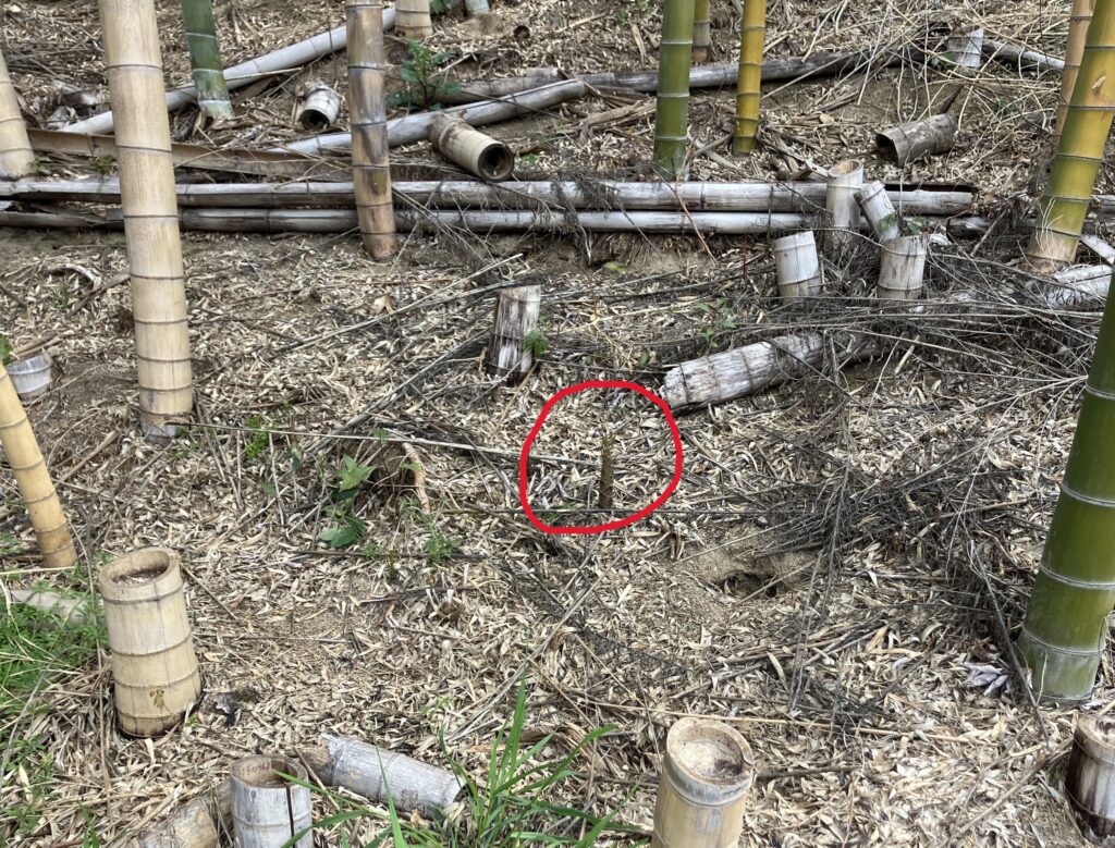 本日は西側のマルチング箇所を確認しました。マルチング箇所にも少し雑草ははえていましたが、変化は感じませんでしたが、西側マルチング箇所の近くに頭を出しているタケノコを発見しました。(赤枠内)今後も確認を継続していきます。