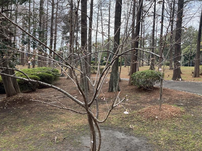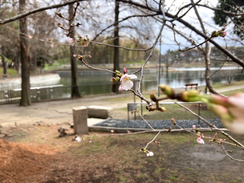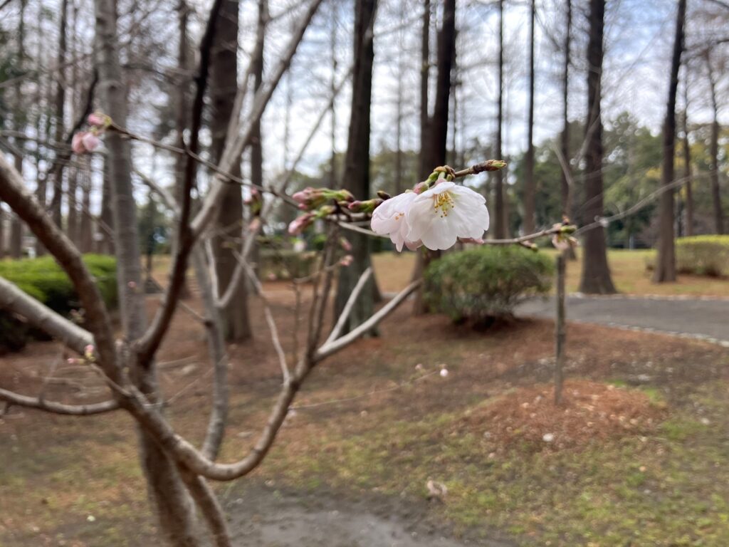 公園内にある健康歩道の近くに植えられている桜の木を見てみると花弁が開いていました。公園へお越しの際は、散策等して花の観賞をしてみてはいかがですか。